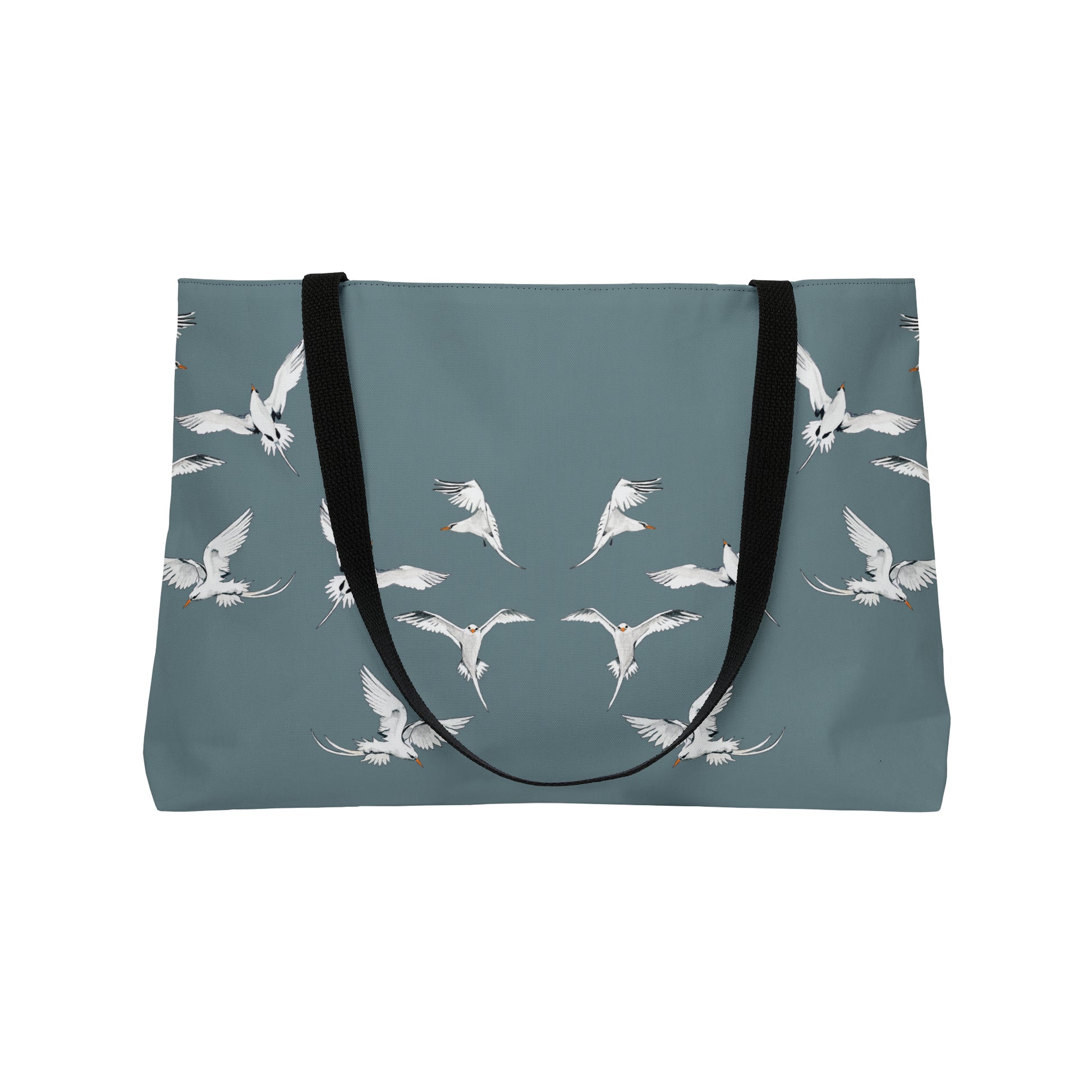 Hold all your towels, blankets, drinks, food and sunblock in this unique print featuring the hand drawn illustrations of the inhabitants of the migrating Longtail (White-tailed Tropicbird). Its t-bottom construction and black handles give it a sleek, classic look.