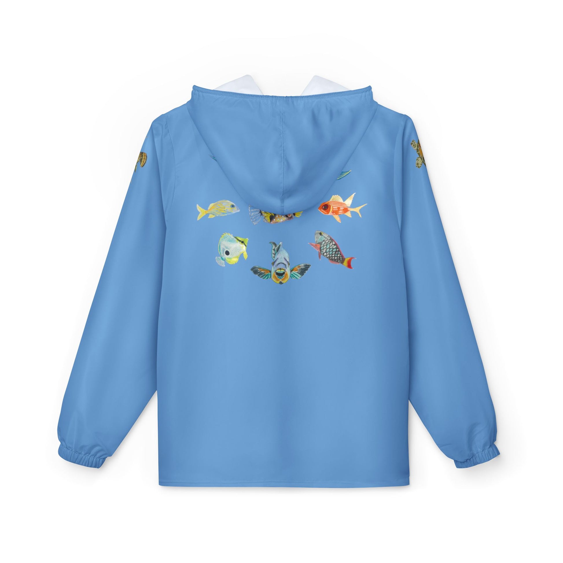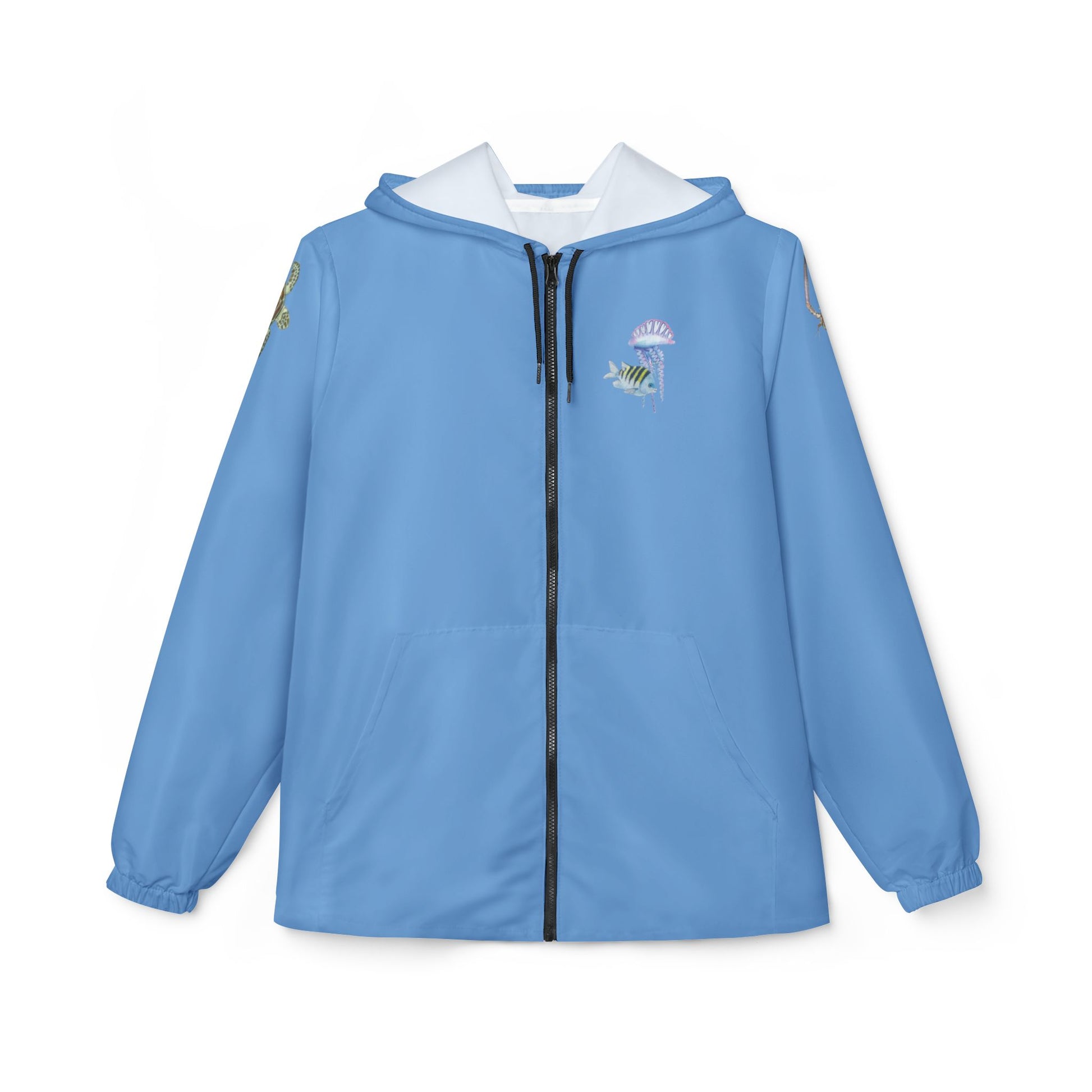 Stay stylish and comfortable with this lightweight windbreaker jacket, perfect for layering in unpredictable weather. This jacket captures a vibrant, playful vibe, making it ideal for those who love to express their individuality and their love for marine life. Whether you're heading to a music festival, a casual day out, or taking a scenic hike, this versatile piece fits seamlessly into your lifestyle. It's an excellent choice for outdoor enthusiasts, casual adventurers, and anyone who appreciates a splash of color in their wardrobe. This windbreaker features my drawing of the wildlife in the Sargasso Sea