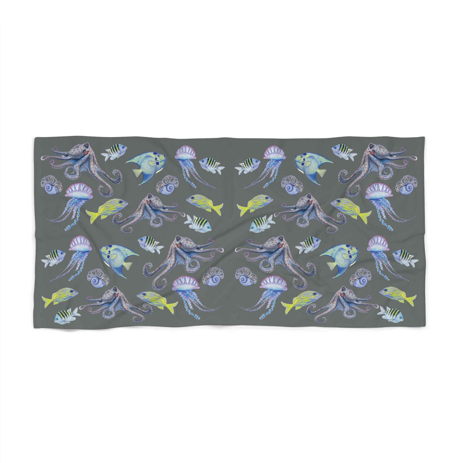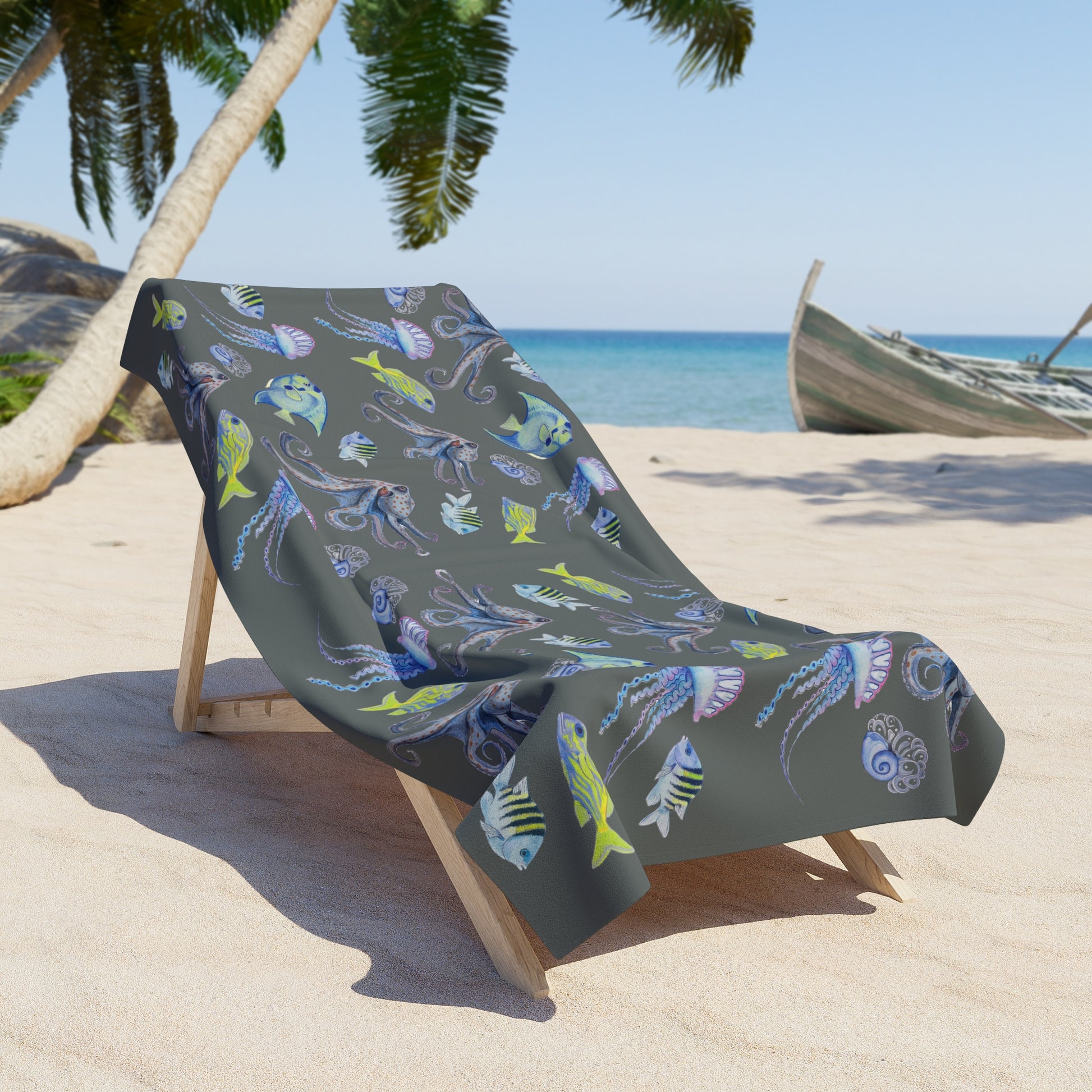 Dry away your cares with this unique beach towel, featuring a hand drawn pattern of the creatures of the wild Sargasso Sea! This heavyweight towel feels extra lush to the touch as it features a quick dry polyester facing, and a cotton loop backing for durability.